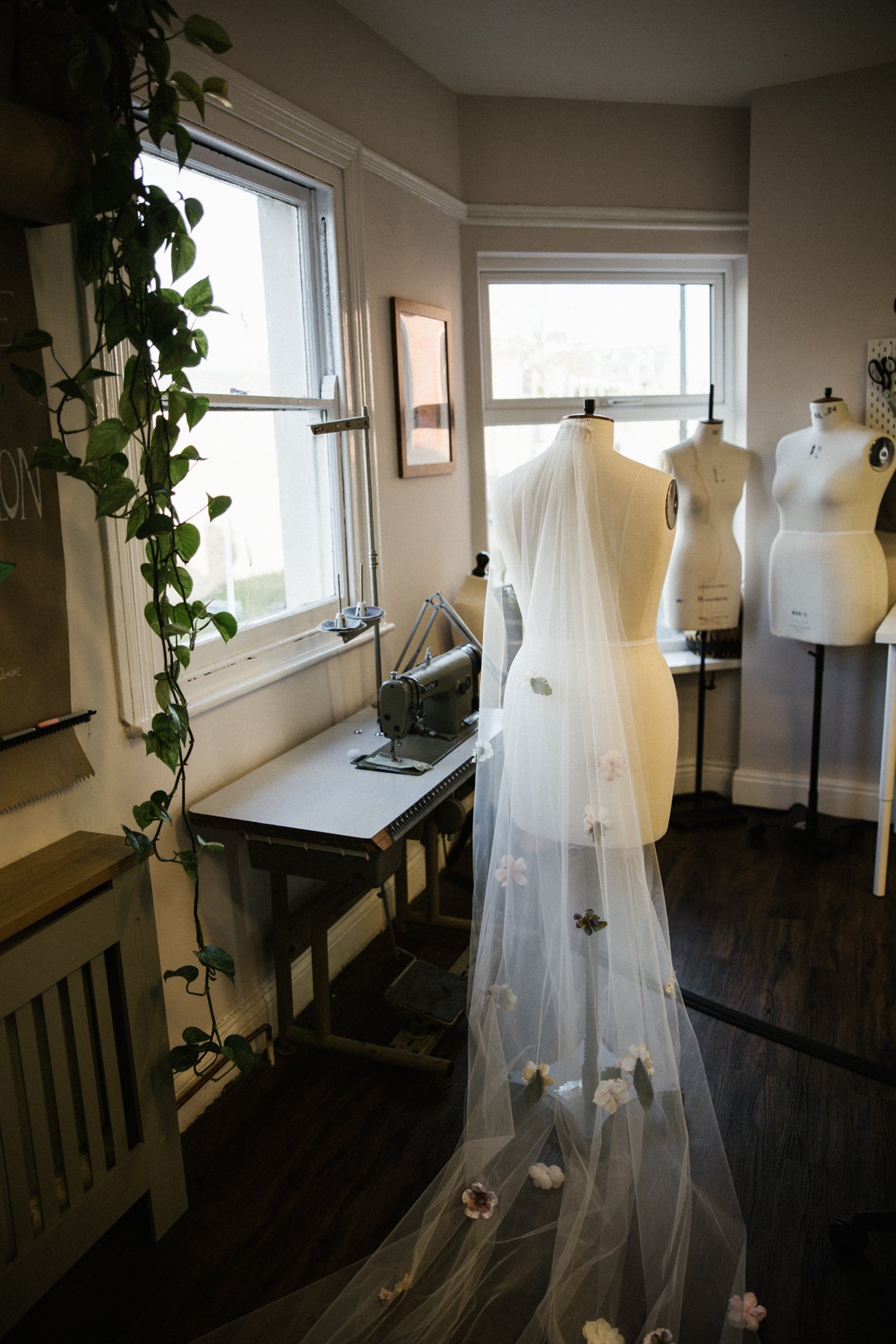 Every E&W design begins life in our Cardiff studio overlooking the castle, where each silhouette is conceived and developed by our small team. Patterns are drafted, fabrics sourced and every detail refined in-house before being entrusted to our specialist makers. By keeping design and quality control under our roof, we ensure every gown carries the same signature fit, finish, and soul. It’s bridal that feels considered, never mass-produced.