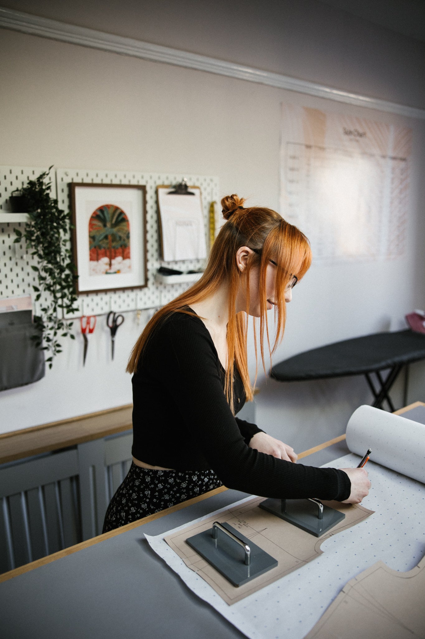 Sophie studied fashion design at Glamorgan University before launching a vintage clothing and homeware store in 2009. There, she began creating one-off dresses from recycled materials, laying the foundations for the E&W ethos of sustainable, small-scale design. In 2014, she launched E&W’s first collection, drawing on vintage pattern cutting and modern styling. Sophie continues to lead the business hands-on, overseeing everything from design and construction to fittings and final production.
