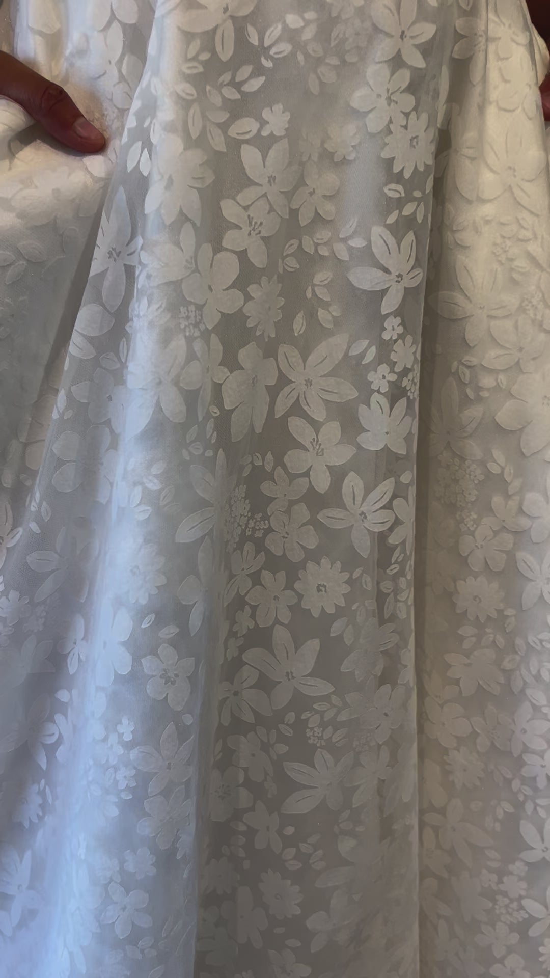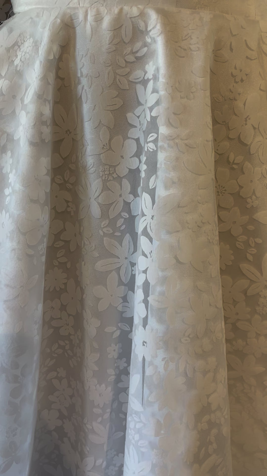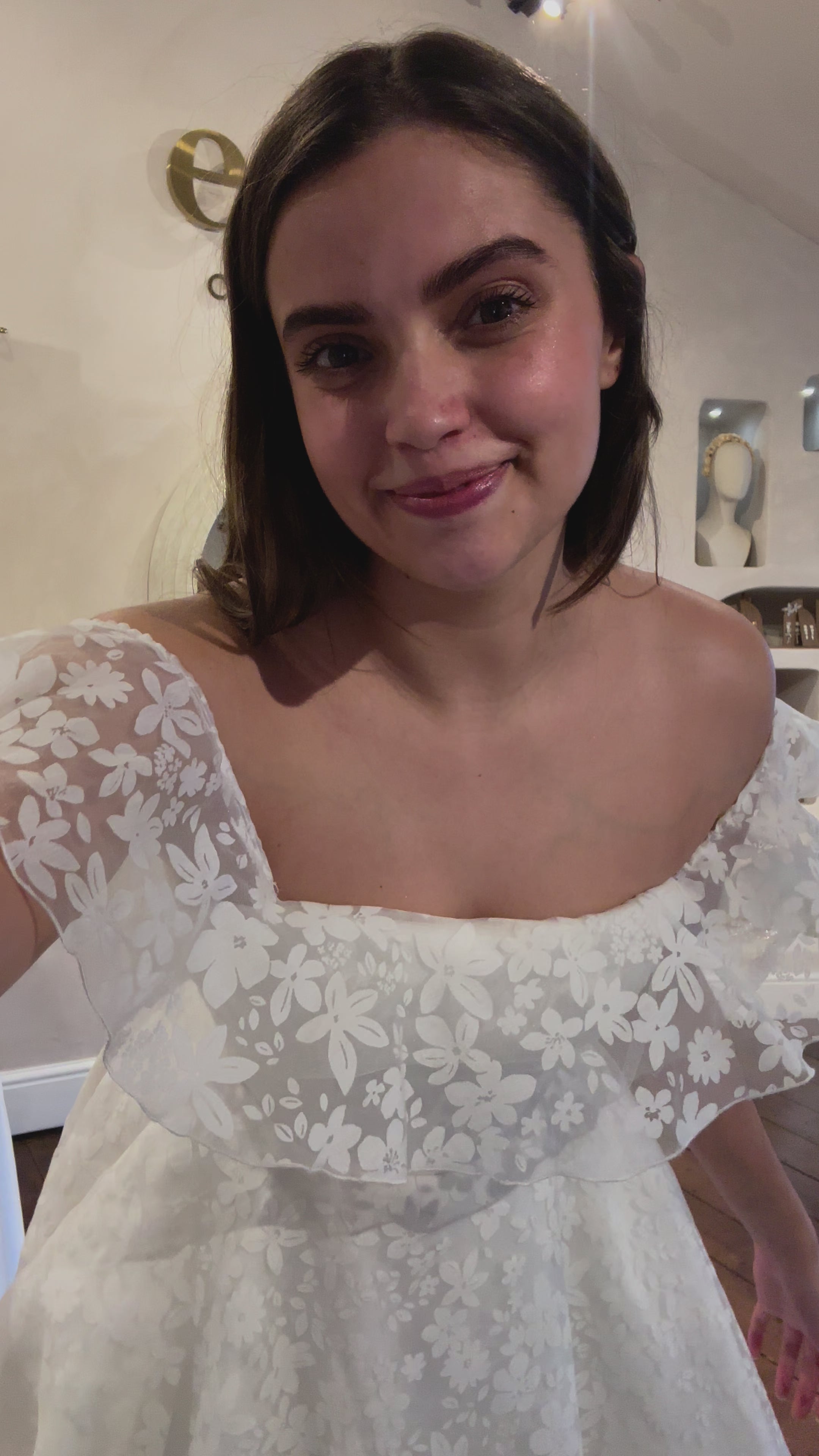 The full-circle skirt is cut in layers of structured Mikado for a voluminous silhouette that moves with quiet impact. Finished with in-seam pockets and a clean train, Bronwen is designed for brides who want timeless shape with strong, modern execution.