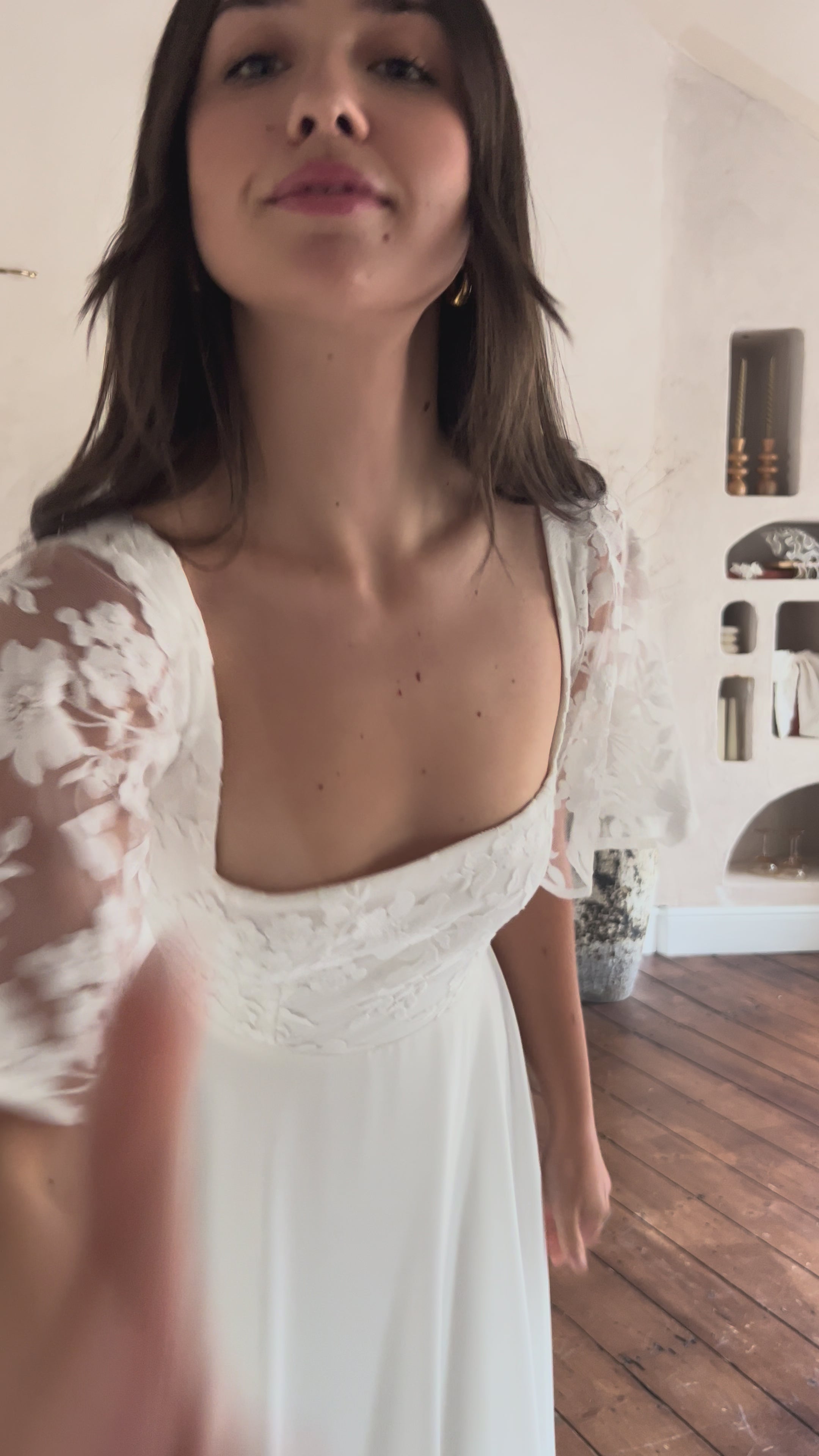 Delicate soft lace defines Camille’s square-neck bodice, accented with a floaty sleeve and a button-top open back that can be partially lined for coverage. Features a full circle georgette skirt that glides with subtle volume over a fluid underskirt, perfect for an aisle that demands a little romance.