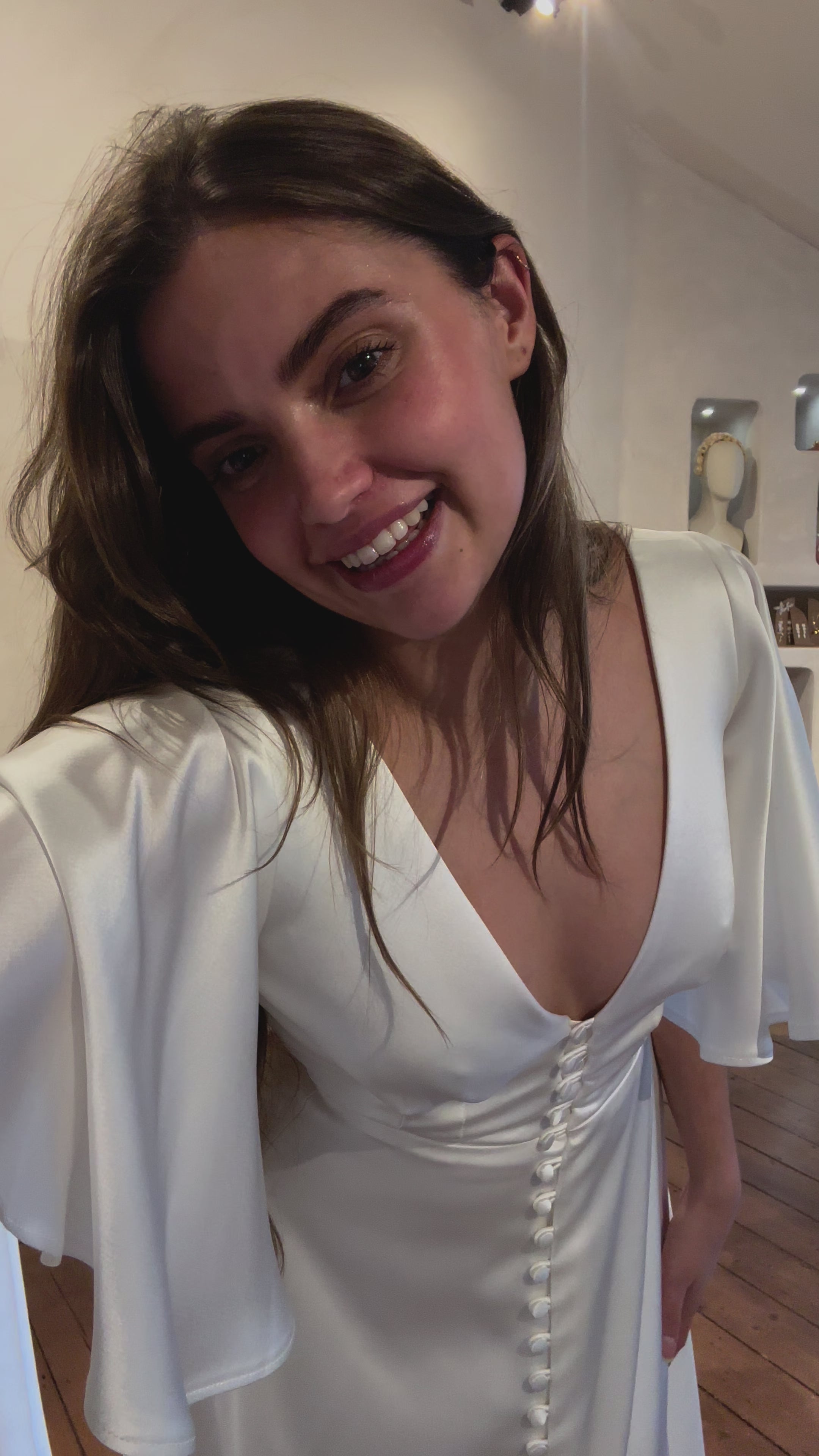 Simplicity redefined. Our Edith bridal gown is made from a heavy, luxurious satin derived from wood pulp, with a flattering double-darted bodice and open-front skirt that balances shape with movement. The plunge neckline and long, floaty sleeves bring softness and depth, while the full skirt opens to a subtle split, creating a clean but considered silhouette.