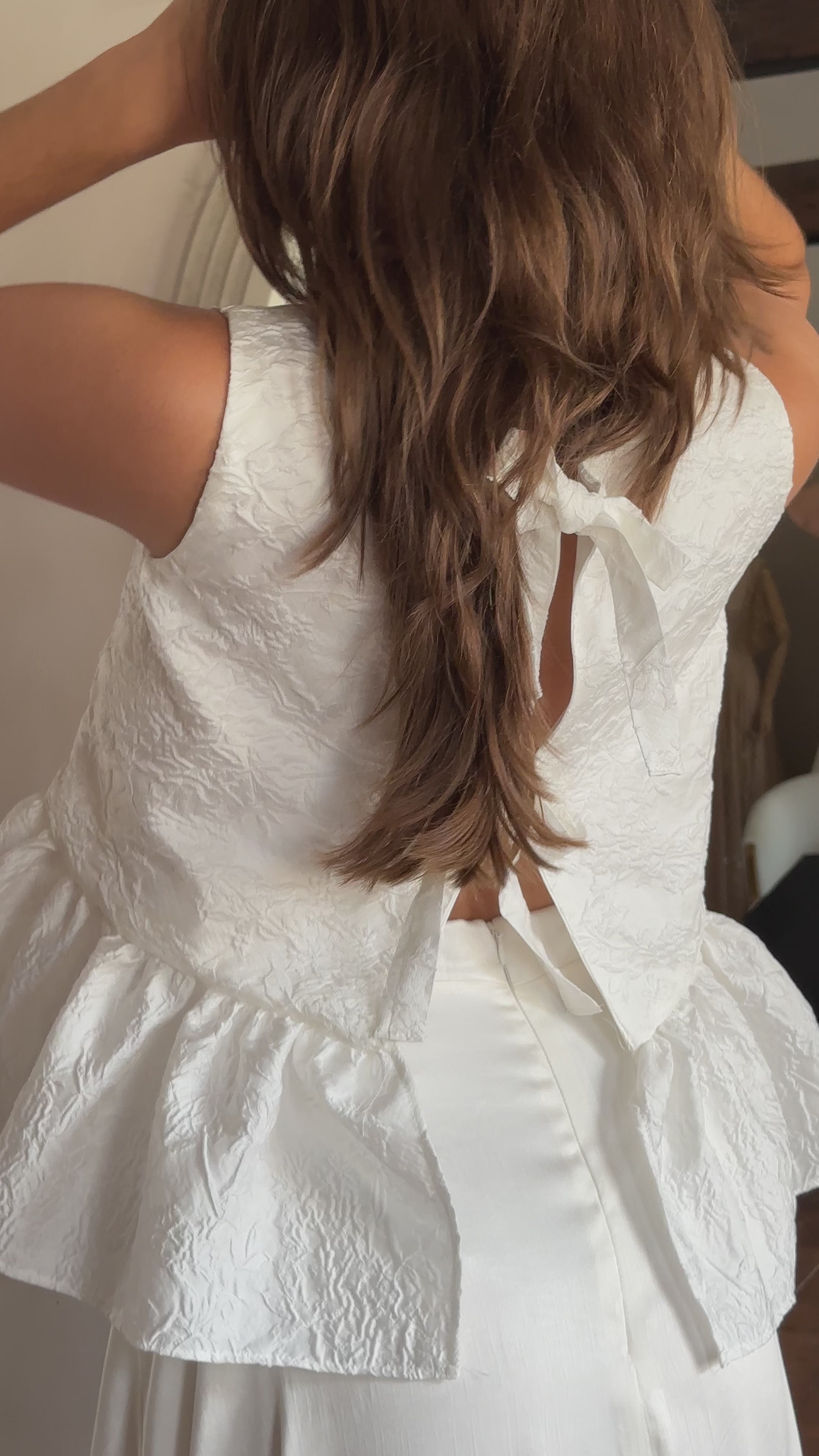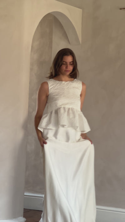 Sculptural French jacquard forms Esme’s high-neck bodice and gathered peplum. A tie-back closure adds a hint of softness to the structured shape.