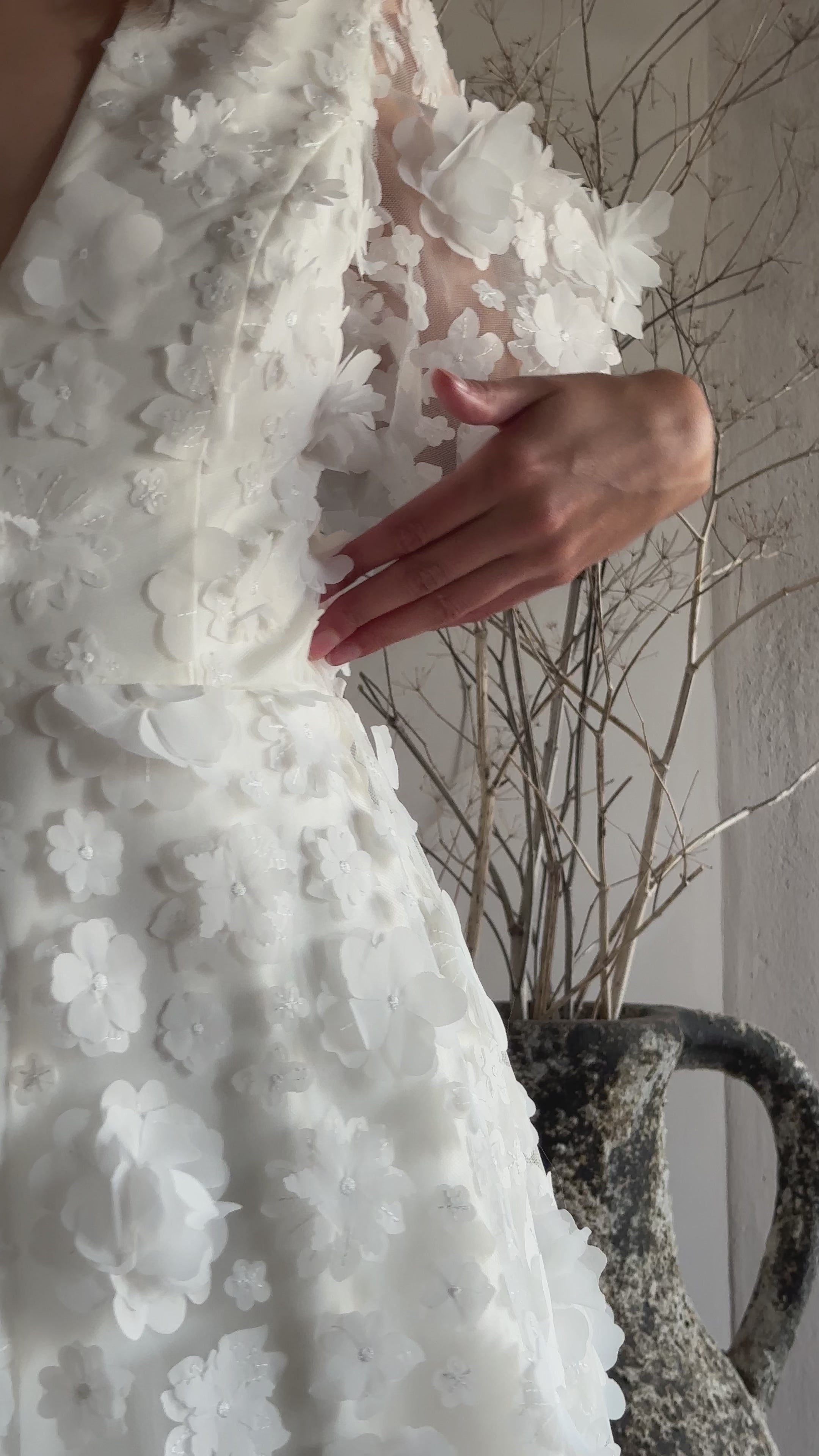 A garden in full bloom, Gracie is cut from 3-D floral tulle layered with organza blossoms for depth and texture. Short puff sleeves and a V-neckline frame the figure, while a soft satin lining supports the airy A-line skirt. An optional higher back provides discreet coverage.