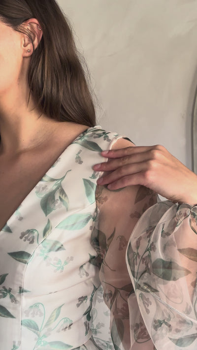 Lily commands attention with it's incredible printed organza layered over crisp duchess satin. A plunging neckline, sheer bishop sleeves and bow-tied back frame a full-circle skirt that moves like liquid. A half-height back option ensures comfort and bra-friendly ease.