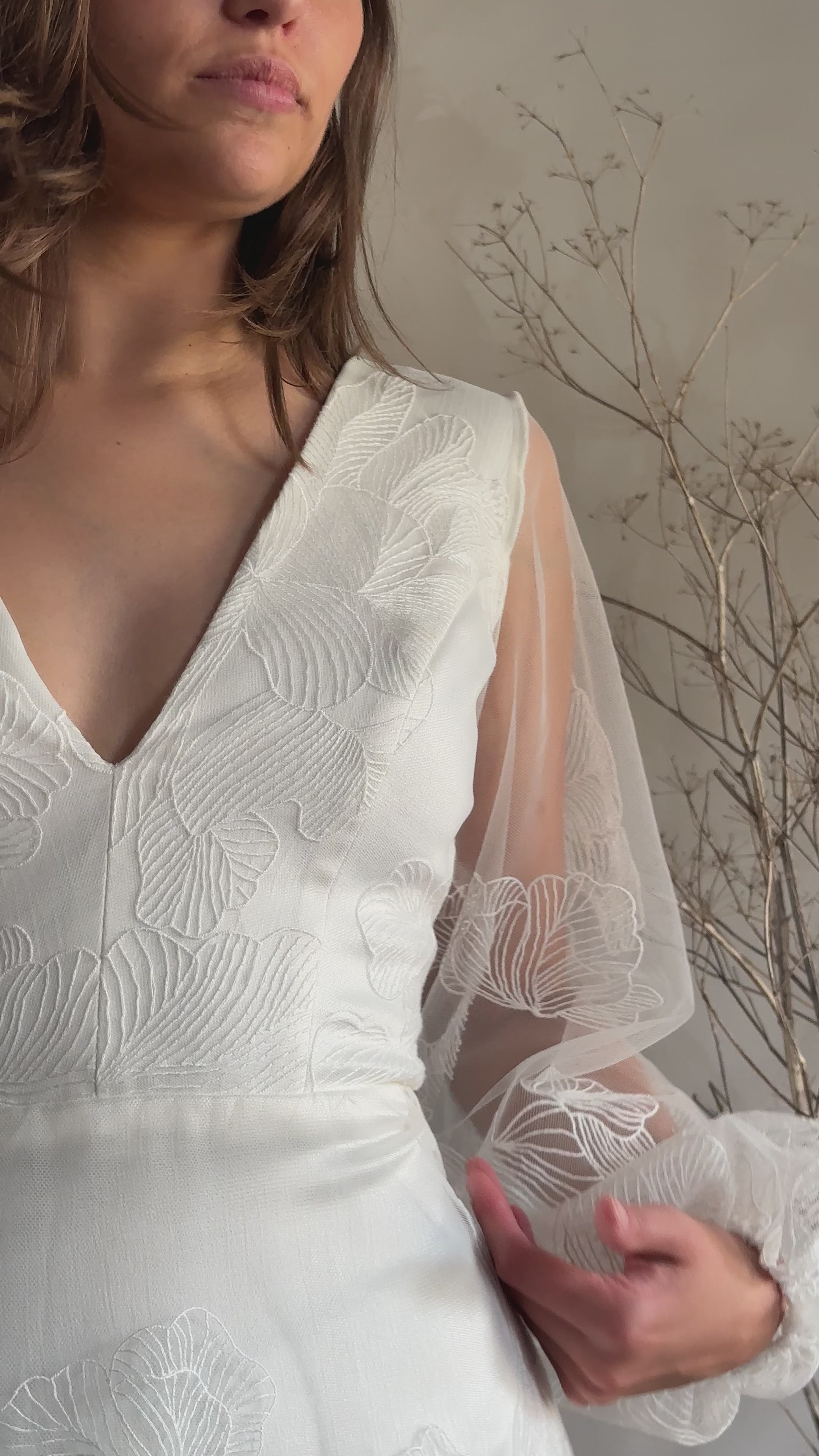 Maisie pairs fine embroidered French lace with a satin A-line skirt for a gown that feels both intricate and easy. A V-neckline and open scoop back (optionally satin-lined for bra support) meet long bishop sleeves gathered softly at the wrist, balancing structure with lightness.