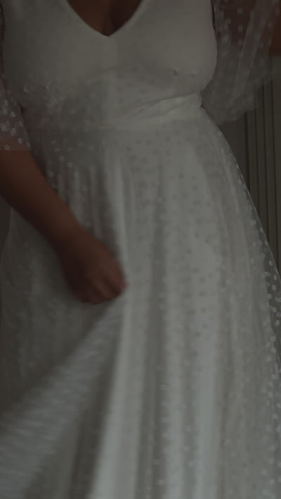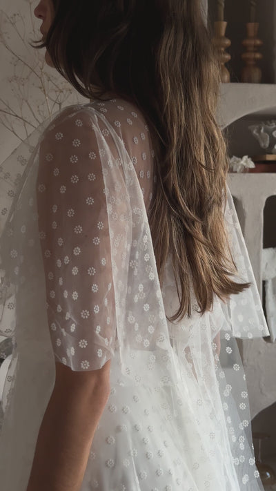 Soft, stretch flocked tulle gives Nansi a dreamy comfort and a flattering full circle skirt. A plunging bodice and bow-tie back meet airy sleeves that float with every step, offering ease without compromise.
