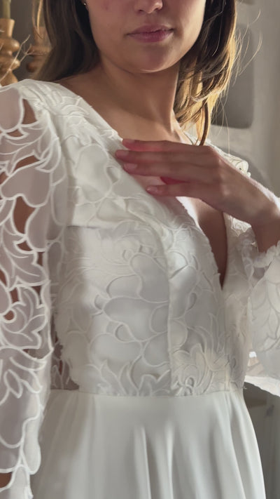 Our iconic Parker gets a fresh interpretation in Penny. A plunging V-neckline meets bishop sleeves, while the striking open lace-cut back is finished with a satin neck tie. A crisp duchess-satin underlay adds body to the skirt, lending gentle fullness and luxurious weight, while still holding it's fluidity with a full circle georgette skirt.