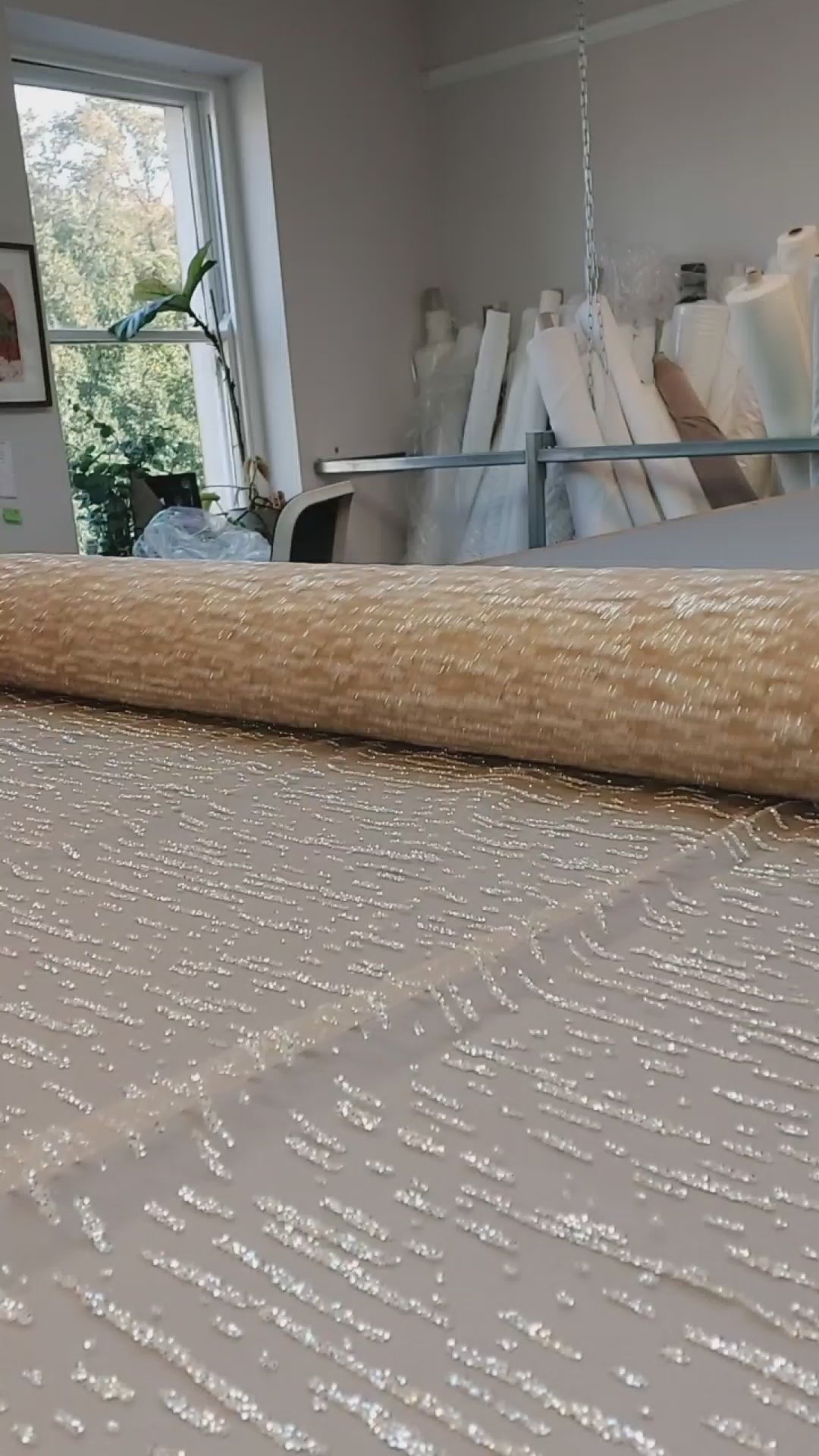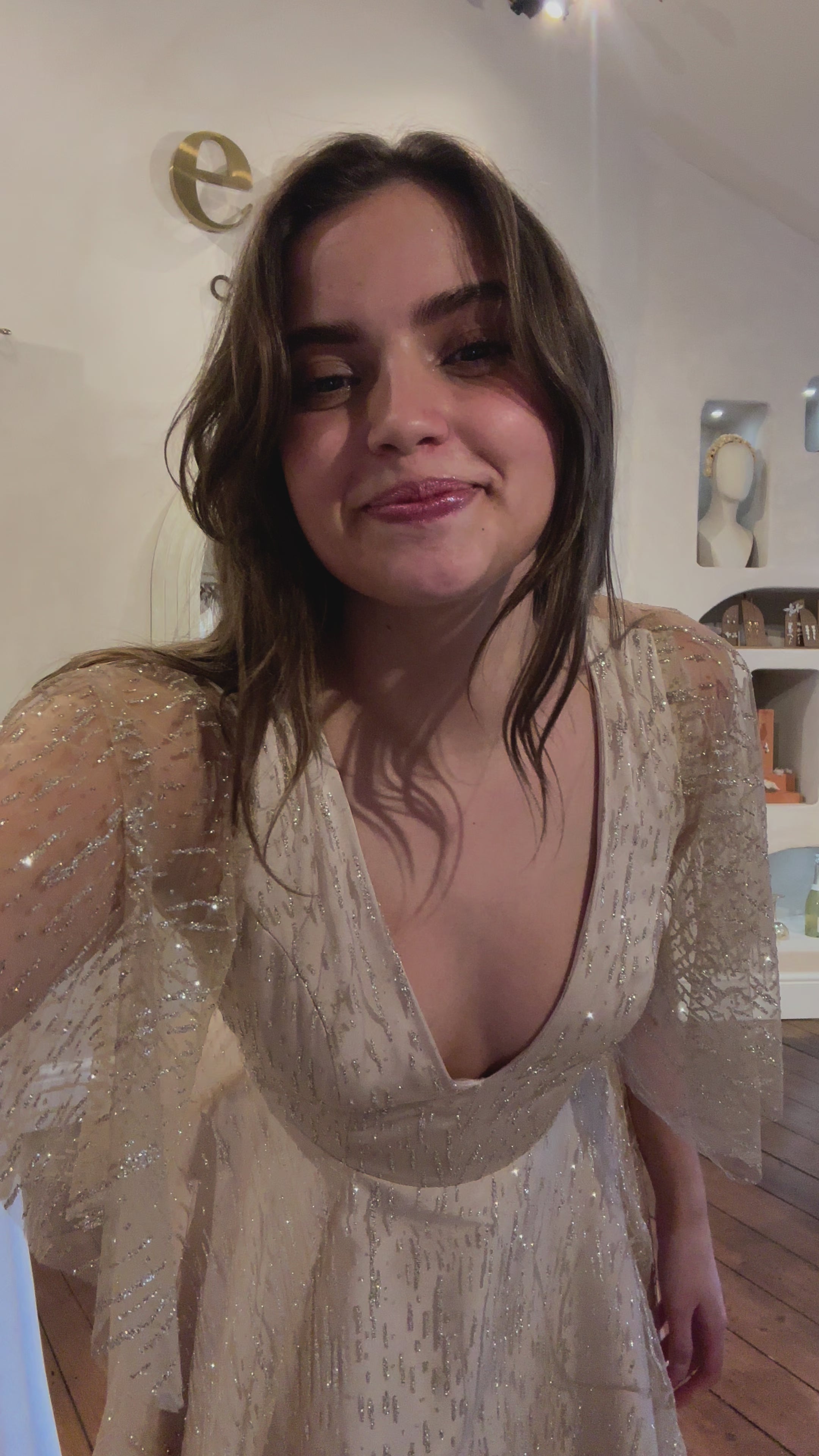 Zeppelin is a gown that glows, quite literally. This dress is cut from champagne satin and overlaid with a gold glitter-dashed tulle, offering a soft shimmer that catches light without overwhelming the silhouette. A plunge bodice and open back keep the shape modern and clean, while the circle-cut sleeves bring a sense of movement and softness.